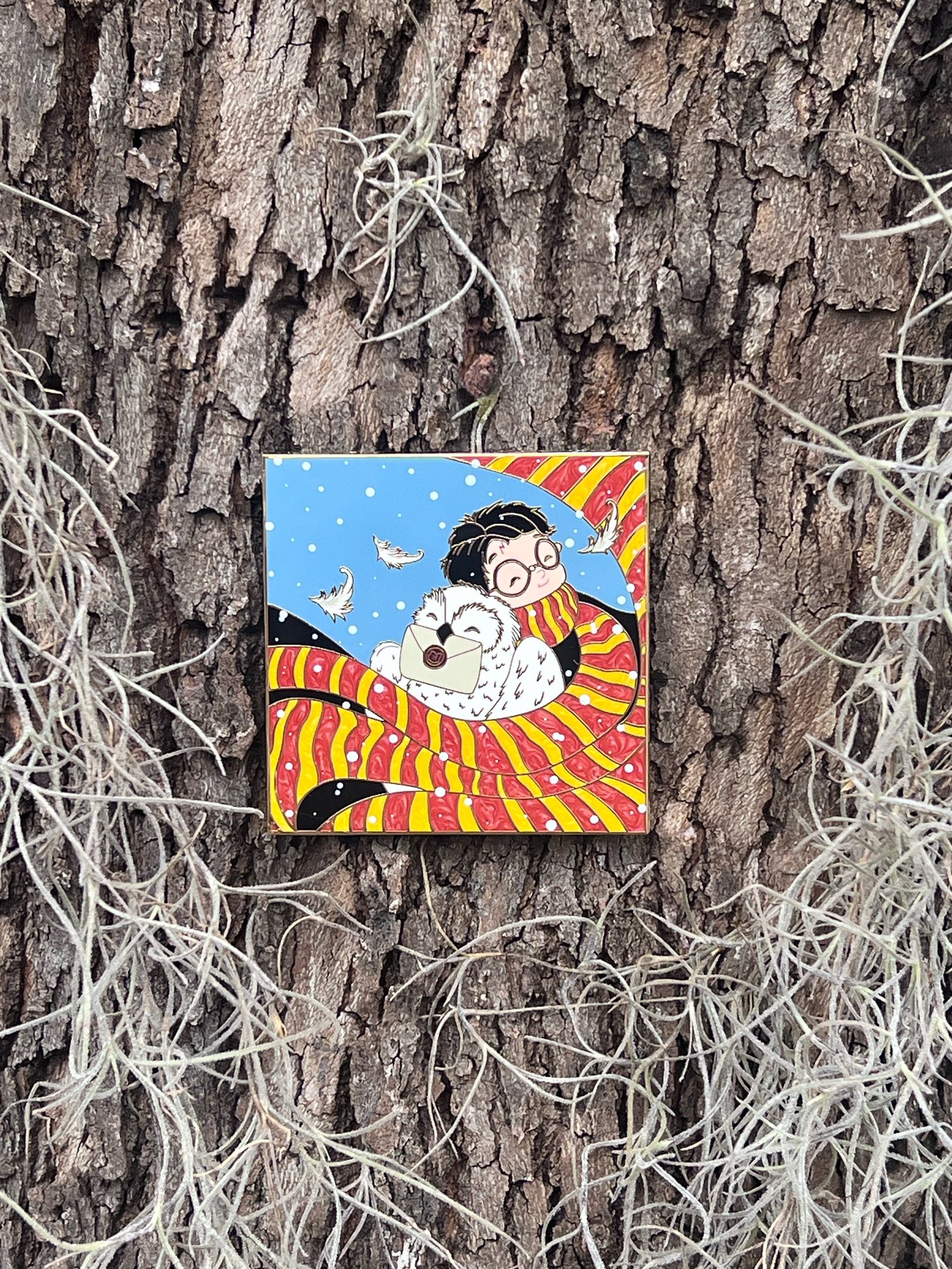 3" by 3" gold plated pin with a custom backstamp, pearl, and print effects. Limited edition of 75